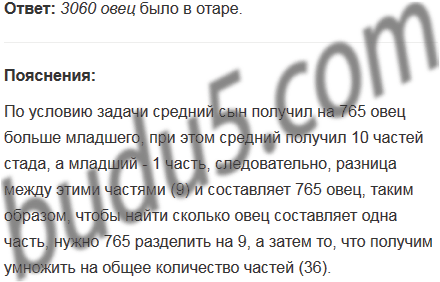 Три сына хана получили в наследство большую отару овец. Старшему сыну достались 25 частей стада, среднему - 10 частей, а младшему - 1 часть. Сколько овец было в отаре, если средний получил на 765 овец больше, чем младший?