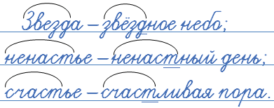 Звезда — звёздное небо; ненастье — ненастный день; счастье — счастливая пора.