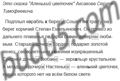 Подплыл к..рабль ... берегу. Сошёл ... трапу на берег кормчий Степан Емельянович. Он привёз из дальнего плаванья п..дарки св..им дочерям любимым. Старшей дочери Гордее п. .дарил золотой венец, сам..цветными к..мнями изукрашенный. Средней дочери Любаве — зерк..льце хрустальное. А младшей дочери Настеньке — ален..кий цветочек, краше которого нет на всём белом свете.