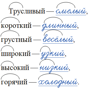 Трусливый — _______, короткий — _______, грустный — _______, широкий — _______, высокий — _______, горячий — _______.
