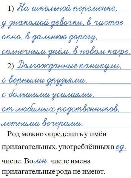1) На школьной (ж. р.) переменке, у знакомой (ж. р.) девочки, в чистое (ср. р.) окно, в дальнюю (ж. р.) дорогу, солнечным (м. р.) днём, в новом (ср. р.) кафе.