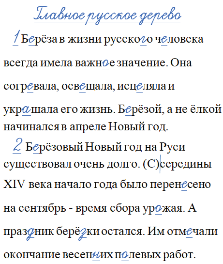 Б_рёза в жизни русско_о ч_ловека всегда имела важн_е значение. Она согр_вала, осв_щала, исц_ляла и укр_шала его жизнь. Б_рёзой, а не ёлкой начинался в апреле Новый год.