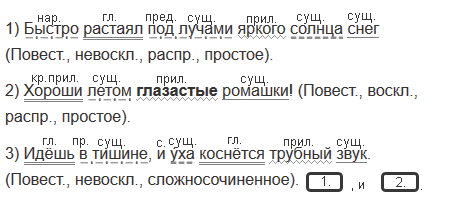 1) Быстро растаял под лучами яркого солнца снег. 2) Хороши летом глазастые ромашки! 3) Идёшь в тишине, и у́ха коснётся трубный звук. (Д. Зуев)