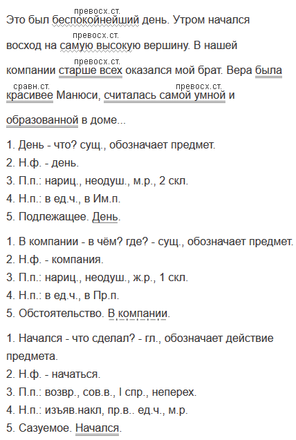 1)Это был беспокойнейший день. (А. Чехов) 2) Утром начался восход на самую высокую вершину. 3) В нашей компании старше всех оказался мой брат. 4) Вера была краси́вее Манюси, считалась самой умной и образованной в доме... (А. Чехов)