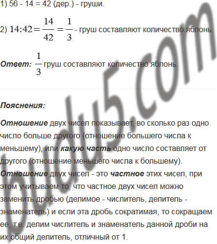 В саду растёт 56 деревьев, из них 14 деревьев составляют яблони, а остальные деревья - груши. Какую часть от количества груш составляют количество яблонь?