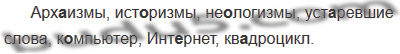Арх..измы, ист..ризмы, не..логизмы, уст..ревшие слова, к..мпьютер, Инт..рнет, кв..дроцикл.