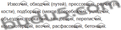 Извоз..ик, обход..ик (путей), прессов..ик, рез..ик (по кости), подбор..Ик (мехов), перебеж..ик, уклад..ик, объезд..ик, прокат..ик, танцов..ик, пере-пис..ик, компьютер..ик, воз..ик, расфасов..ик, бетон..ик.