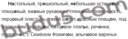 (На)стольный, пр..школьный, (не)большая остано..ка, плюш..вый, еж..вые рукавицы, глянц..вая поверхность, перц..вый пластырь, тихий ш..пот, красным плащ..м, под маленьким деревц..м, ситц..вое плат(?)е, реч..нка, порядоч..к, с Семёном Фомич..м, алыч..вое варенье.