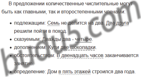 | Определение | Мне нравится число "пять". Груз в пятнадцать килограммов был благополучно доставлен хозяину. |