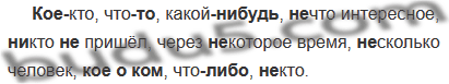 (Кое)кто, что(то), какой(нибудь), (не)что интересное, (н..)кто (не)пришёл, через (не)которое время, (не)сколько человек, (кое)о(ком), что(либо), (не)кто.