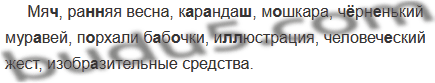 Мяч(?), ра(н, нн)яя весна, к..р..ндаш(?), м..шкара, ч..рн..нький мур..вей, п..рхали б..б..чки, и(л, лл)юстрация, человеч..ский жест, изобр..зительные средства.
