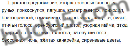 Пр..стое предл..жение, втор..степенные члены, у руч(?)я, прик..снулся, л..гушка, всматрива..тся, пр..ходил, (благо)нравный, взмахива..т, (северо)запад, к..пуста, ни(з, с)ко, птич(?)и голоса, оренбур(?)ский платок, узорная к..йма, ..тюд к картине, с помощ(?)ю, п..лотна, на опушк.. леса, бе(с, сс)онная ночь, ж..лтая к..н..рейка, с..реневые цветы.
