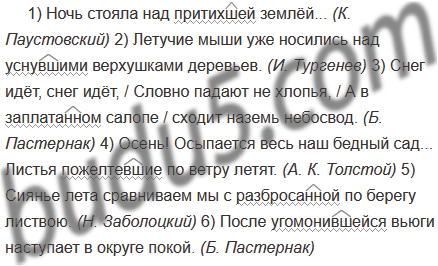 1) Ночь стояла над притихшей землёй... (К. Паустовский) 2) Летучие мыши уже носились над уснувшими верхушками деревьев. (И. Тургенев) 3) Снег идёт, снег идёт, / Словно падают не хлопья, / А в заплатанном салопе / сходит наземь небосвод. (Б. Пастернак) 4) Осень! Осыпается весь наш бедный сад... Листья пожелтевшие по ветру летят. (А. К. Толстой) 5) Сиянье лета сравниваем мы с разбросанной по берегу листвою. (Н. Заболоцкий) 6) После угомонившейся вьюги наступает в округе покой. (Б. Пастернак)
