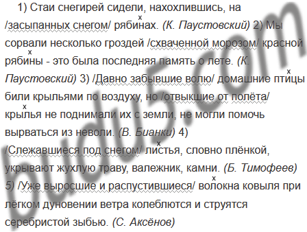 1) Стаи снегирей сидели, нахохлившись, на засыпанных снегом рябинах. (К. Паустовский) 2) Мы сорвали несколько гроздей схваченной морозом красной рябины - это была последняя память о лете. (К. Паустовский) 3) Давно забывшие волю домашние птицы били крыльями по воздуху, но отвыкшие от полёта крылья не поднимали их с земли, не могли помочь вырваться из неволи. (В. Бианки) 4) Слежавшиеся под снегом листья, словно плёнкой, укрывают жухлую траву, валежник. камни. (Б. Тимофеев) 5) Уже выросшие и распустившиеся волокна ковыля при лёгком дуновении ветра колеблются и струятся серебристой зыбью. (С. Аксёнов)