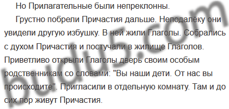 Давно это было. Стояла в лесу избушка. И жили в ней Прилагательные. А по соседству с ними бродили в лесу Причастия. И не было у них ни хлеба, ни крова. Вот собрались как-то Причастия и решили проситься на постоянное жительство к Прилагательным. Пошли они к избушке, где Прилагательные жили, постучали и попросили пустить их к себе жить. Только не согласились Прилагательные принять гостей, отправили их к Глаголам: «Вы глагольного происхождения, вот и идите к ним жить!»