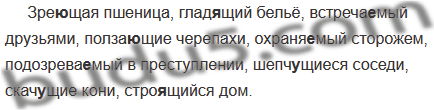 Зре..щая пшеница. глад..щий бельё, встреча..мый друзьями, полза..щие черепахи, охраня..мый сторожем, подозрева..мый в преступлении, шепч..щиеся соседи, скач..щие кони, стро..щийся дом.