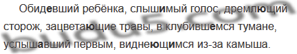 Обид..вший ребёнка, слыш..мый голос, дремл..щий сторож, зацвета..щие травы, в клубивш..мся тумане, услыш..вший первым, видне..щ..мся из-за камыша.
