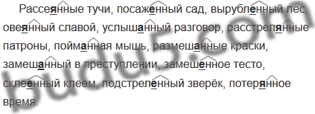 Рассе..нные тучи, посаж..нный сад, вырубл..нный лес, ове..нный славой, услыш..нный разговор, расстрел..нные патроны, пойм..нная мышь, размеш..нные краски, замеш..нный в преступлении, замеш..нное тесто, скле..нный клеем, подстрел..нный зверёк, потер..нное время.