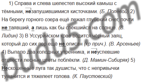1) Справа и слева шелестел высокий камыш с тёмными, (не)запушившимися кисточками. (Б. Полевой) 2) На берегу горного озера ещё лежал глубокий снег, почти (не)таявший, а лишь как бы спёкшийся на солнце. (В. Лидин) 3) В Уссурийском крае водится чёрный заяц, который до сих пор ещё (не)описан. (В. Арсеньев) 4) Выпало два холодных утренника, и (не)успевшие отцвести лесные цветы поблёкли. (Д. Мамин-Сибиряк) 5) (Не)скошенные луга так душисты, что с непривычки туманится и тяжелеет голова. (К. Паустовский)
