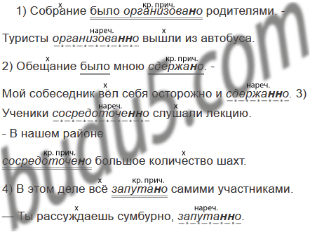 1) Собрание было организова(н,нн)о родителями. - Туристы организова(н,нн)о вышли из автобуса. 2) Обещание было мною сдержа(н, нн)о. - Мой собеседник вёл себя осторожно и сдержа(н, нн)о. 3) Ученики сосредоточе(н, нн)о слушали лекцию. - В нашем районе сосредоточе(н, нн)о большое количество шахт. 4) В этом деле всё запута(н,нн)о самими участниками. — Ты рассуждаешь сумбурно, запута(н, нн)о.