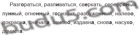 Разг..раться, разл..ваться, св..ркать, серебр..(н,нн)ый, лу(н,нн)ый, огне(н,нн)ый, г..ризонт, разбуже(н,нн)ый, налев.., докрасн.., сначал.., занов.., издавн.., снов.., насух.., дочист.. .
