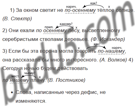 1) За окном светит не по-осеннему тёплое солнце. (В. Спектр) 2) Они ехали по осеннему лесу, высветленному серебристыми стволами деревьев. (Ф. Искандер) 3) Если бы эта ворона могла говорить по-нашему, она рассказала бы много интересного. (А. Волков) 4) Сегодня ночью будем действовать по нашему плану. (В. Постников)