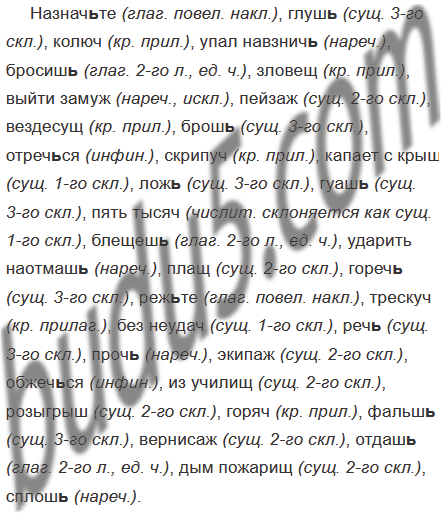 Назнач(?)те, глуш(?), колюч(?), упал навзнич(?), бросиш(?), зловещ(?), выйти замуж(?), пейзаж(?), вездесущ(?), брош(?), отреч(?)ся, скрипуч(?), капает с крыш(?), лож(?), гуаш(?), пять тысяч(?), блещеш(?), ударить наотмаш(?), плащ(?), гореч(?), реж(?)те, трескуч(?), без неудач(?), реч(?), проч(?), экипаж(?), обжеч(?)ся, из училищ(?), розыгрыш(?), горяч(?), фальш(?), вернисаж(?), отдаш(?), дым пожарищ(?), сплош(?).