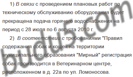 1) ... проведением плановых работ по техническому обслуживанию оборудования будет прекращена подача горячего водоснабжения на период с 28 июля по 6 августа 2010 г.