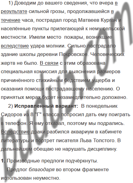 1) Доводим до вашего сведения, что вчера в результате сильной грозы, продолжавшейся в течение часа, пострадал город Матвеев Курган и населённые пункты прилегающей к нему сельской местности. Имели место пожары, возникшие вследствие удара молнии. Сильно пострадало здание школы деревни Покровское. Человеческих жертв не было. В связи с этим образована специальная комиссия для выяснения размеров причинённого стихийным бедствием ущерба и оказания помощи пострадавшему населению. О принятых мерах будет незамедлительно доложено.