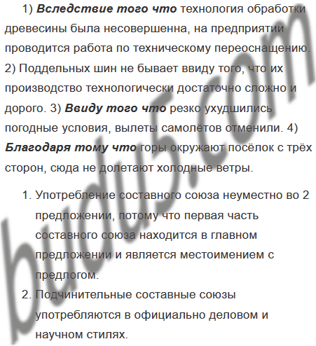 1) Вследствие того что технология обработки древесины была несовершенна, на предприятии проводится работа по техническому переоснащению. 2) Поддельных шин не бывает ввиду того, что их производство технологически достаточно сложно и дорого. 3) Ввиду того что резко ухудшились погодные условия, вылеты самолётов отменили. 4) Благодаря тому что горы окружают посёлок с трёх сторон, сюда не долетают холодные ветры.