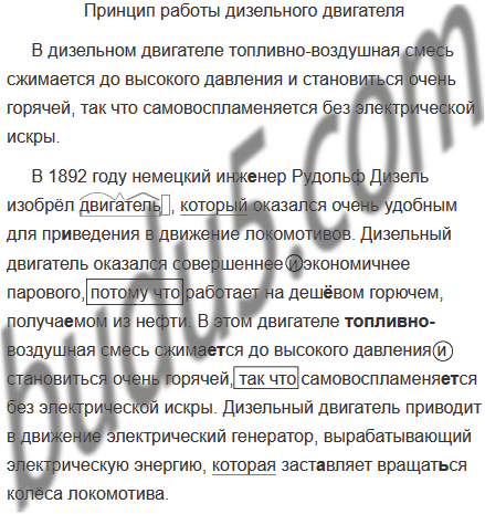 В 1892 году немецкий инж..нер Рудольф Дизель изобрёл двигатель2 который оказался очень удобным для пр..ведения в движение локомотивов. Дизельный двигатель оказался совершеннее и экономичнее парового потому что работает на деш..вом горючем получа..мом из нефти. В этом двигателе (топливно)воздушная смесь сжима..т(?)ся до высокого давления и становиться очень горячей так что самовоспламеня..т(?)ся без электрической искры. Дизельный двигатель приводит в движение электрический генератор вырабатывающий электрическую энергию которая заст..вляет вращат(?)ся колёса локомотива.
