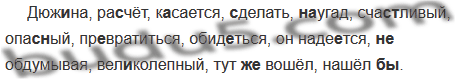 Дюж..на, ра(с, сс)чёт, к..сается, (з,с)делать, (на)угад, счас(?)тливый, опас(?)ный, пр..вратиться, обид..ться, он наде..тся, (не)обдумывая, вел..колепный, тут(же) вошёл, нашёл (бы).