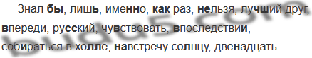 Знал (бы), лиш.., име(н,нн)о, (как)раз, (не)льзя, лу..чий друг, (в)переди, ру(с, сс)кий, чу(?)ствовать, (в)последстви.., соб..раться в хо(л, лл)е, (на)встречу со(?)нцу, две(н,нн)адцать.