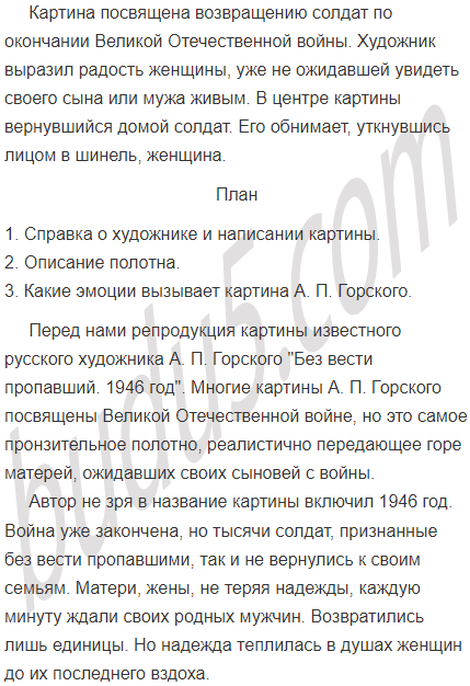Рассмотрите репродукцию картины А. П. Горского «Без вести пропавший. 1946 год». Какой теме она посвящена? Как вы думаете, какие мысли и чувства выразил художник? Какова композиция картины? Как вы понимаете название картины? Какое настроение у вас вызывает это произведение? Какова, по вашему мнению, роль цветовой гаммы картины в создании определённого настроения у зрителей?
