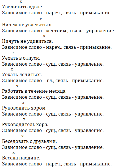 Укажите, какой частью речи является зависимое слово, и назовите способ связи слов в словосочетаниях. Сделайте вывод о том, какие части речи могут употребляться в качестве зависимых слов при согласовании, управлении, примыкании.