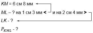 По условию сторона треугольника KML равна 6 см 8 мм, а сторона ML на 1 см 3 мм короче (меньше) стороны KM, значит,