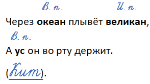 Чтобы определить падеж имени существительного, необходимо задать к нему вопрос: плывёт через (что?) океан (В. п.); плывёт (кто?) великан (И. п.); держит (что?) ус (В. п.).